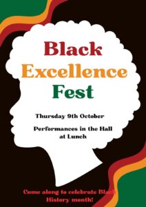 We are looking forward to our Black Excellence Fest performances at lunchtime today. Thank you and congratulations to all our brilliant students who are participating in the event.