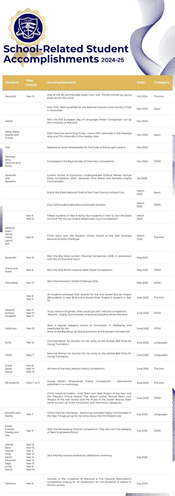 A sample of student enrichment and extra-curricular accomplishments, 2024-25